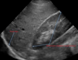 La ecografía identifica líquido libre como colección anecoica en estos espacios.