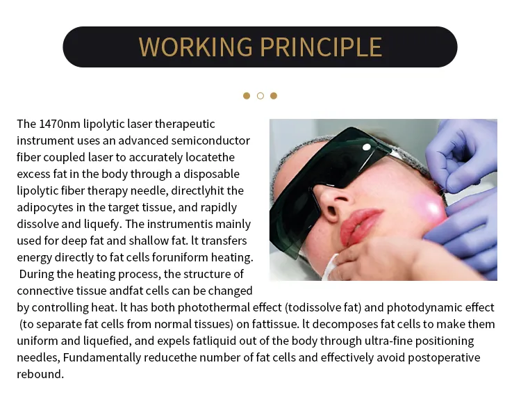 El dispositivo de lipólisis láser de 1470 nm logra la ablación de grasa y el estiramiento de la piel a través de un mecanismo fototérmico avanzado, que funciona de la siguiente manera: