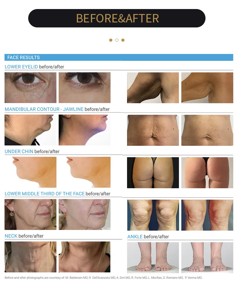 Estiramiento de la piel: La energía térmica estimula la remodelación del colágeno, lo que lleva a una tasa de contracción de la piel del 15% al 30% después del tratamiento, previniendo eficazmente la laxitud de la piel comúnmente asociada con la liposucción convencional.