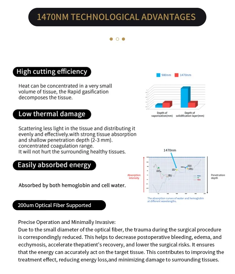 La alta capacidad de absorción de agua de la longitud de onda de 1470 nm garantiza que la energía se concentre en la capa adiposa, evitando daños en la epidermis y los tejidos profundos. La fibra óptica de 200 μm permite un acceso flexible tanto a la grasa superficial (p. ej., papada) como a la grasa profunda (p. ej., abdomen), logrando una precisión milimétrica en los tratamientos.