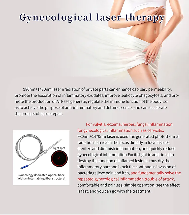 Equipado con longitudes de onda de 980 nm y 1470 nm, este dispositivo proporciona dos beneficios: eliminación de grasa eficiente y tratamientos ginecológicos. Esta máquina con certificación CE es perfecta para el contorno corporal, la reducción de la celulitis y el cuidado ginecológico, ya que ofrece tratamientos seguros e indoloros. Ideal para clínicas que buscan diversificar los servicios, ofrece resultados medibles con un tiempo de inactividad mínimo.
