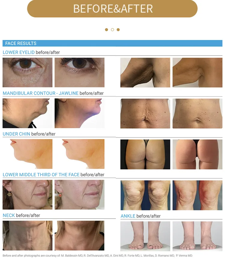 Combinado con la tecnología de enfriamiento epidérmico, permite el derretimiento preciso de la grasa y el estiramiento de la piel en áreas delicadas (como la mentón y la papada) y reduce el riesgo de daño térmico.