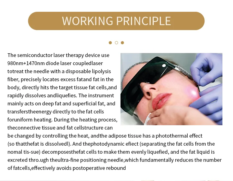 Activación de células grasas: Los láseres de 980 nm y 1470 nm penetran en las capas de grasa subcutáneas a través de fibra óptica, calentando las células grasas hasta su umbral de descomposición.