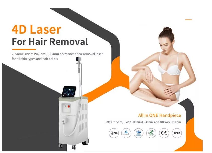 1. Cuatro longitudes de onda se integran en el mismo dispositivo. Los láseres de 755 nm, 808 nm, 940 nm y 1064 nm son perfectos para todo tipo de piel (I, I, II, IV, V, VI) y todo tipo de vello, como grueso, fino, negro, gris, rubio, castaño, etc., en cualquier época del año.