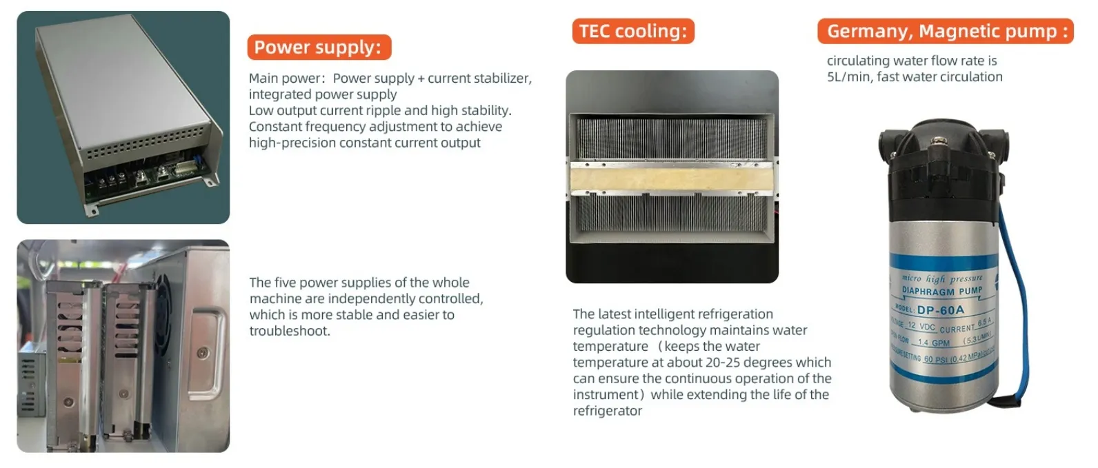 ·Gestión inteligente de la refrigeración: El sistema de refrigeración se ajusta automáticamente en función de la temperatura del agua. Solo un enfriador y un ventilador funcionan cuando la temperatura del agua es inferior a 25 °C; y solo cuando la temperatura es superior a 25 ° C se activan el enfriador doble y el ventilador. Esta configuración de enfriamiento reduce el trabajo inútil y prolonga la vida útil de la máquina.