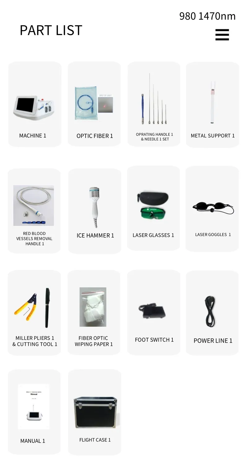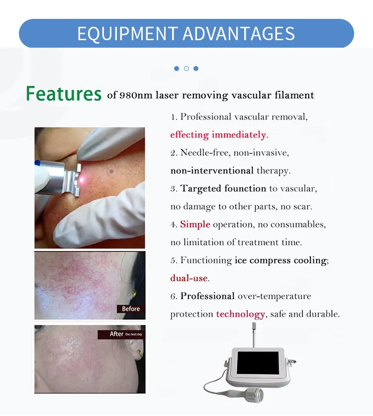 La longitud de onda de 980 nm es el espectro de absorción óptimo de la porfirina en las células vasculares. Cuando la energía del láser de alta energía es absorbida por las células vasculares anormales, induce una coagulación térmica controlada de los vasos sanguíneos objetivo, que luego se absorben naturalmente a través de las vías linfáticas.