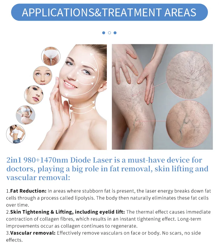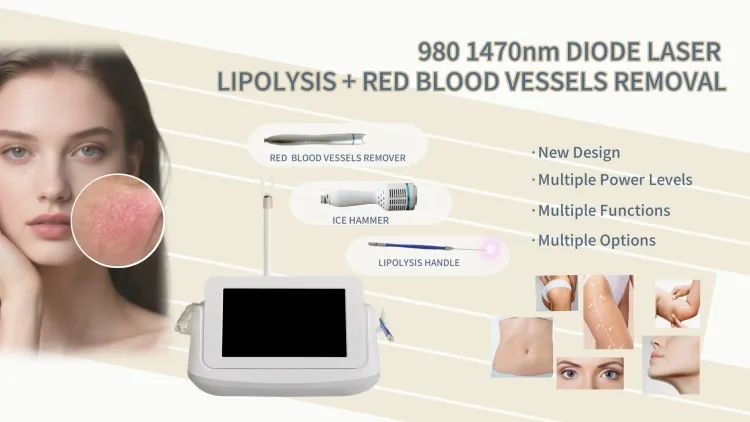 La máquina adelgazante de lipólisis por liposucción láser 980 1470 NM es una innovación estética revolucionaria que redefine el contorno corporal mínimamente invasivo y el rejuvenecimiento facial. Este dispositivo profesional aprovecha la tecnología de doble longitud de onda (980 nm para la eliminación específica de grasa y 1470 nm para el estiramiento de la piel y el levantamiento de párpados) para brindar resultados transformadores en un tratamiento único y eficiente. Combina precisión, seguridad y versatilidad para tratar la grasa rebelde, la flacidez de la piel y el envejecimiento de los párpados con una eficacia inigualable.