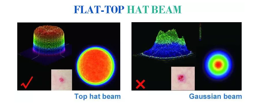 • 4. Modo “Flat-top”, densidad de energía uniforme: la energía se puede entregar de manera eficiente al área de tratamiento, maximizando el efecto y minimizando el daño a los tejidos circundantes.