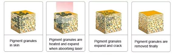 La energía del láser Nd:YAG Q-switched puede ser absorbida por el pigmento del tejido objetivo, como tatuajes, manchas, marcas de nacimiento, etc. El pigmento se fragmenta a un tamaño tan pequeño que puede ser metabolizado por el sistema linfático y excretado.