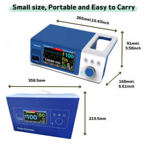 6. Pantalla y alertas: Equipado con una pantalla LCD a color de 5 pulgadas para una fácil visualización, alertas sonoras de tono variable para que los médicos controlen los cambios de SpO2 y un botón de silencio con un temporizador de cuenta regresiva para una operación conveniente.