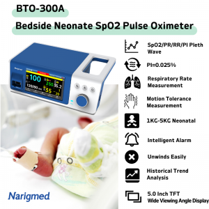 El sistema de monitoreo de SpO2 de cabecera BTO-300A proporciona lecturas precisas y confiables incluso con baja perfusión y interferencia de señal inducida por el movimiento, lo que permite a los médicos obtener un monitoreo continuo de la SpO2, la frecuencia del pulso, la presión arterial, la temperatura y el estado respiratorio de los pacientes.