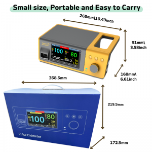 6. Pantalla y alertas: pantalla LCD a color de 5 pulgadas para una fácil visualización; alertas sonoras de tono variable para que los médicos controlen los cambios de SpO2; Botón de silencio con temporizador de cuenta regresiva para facilitar su uso.
