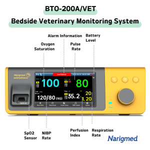 El sistema de monitoreo de SpO2 de cabecera veterinaria BTO-200A/VET de Narigmed proporciona un monitoreo de salud confiable y preciso en una amplia gama de condiciones y entornos para una atención integral al paciente.